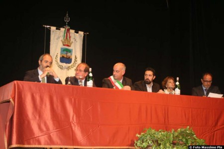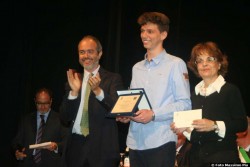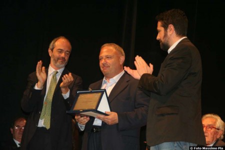Michele Albanese riceve da Arrigo j. Benedetti e dal presidente dell'Unione dei Comuni della Mediavalle del Serchio Andrea Bonfanti la targa per il premio Benedetti 2015.